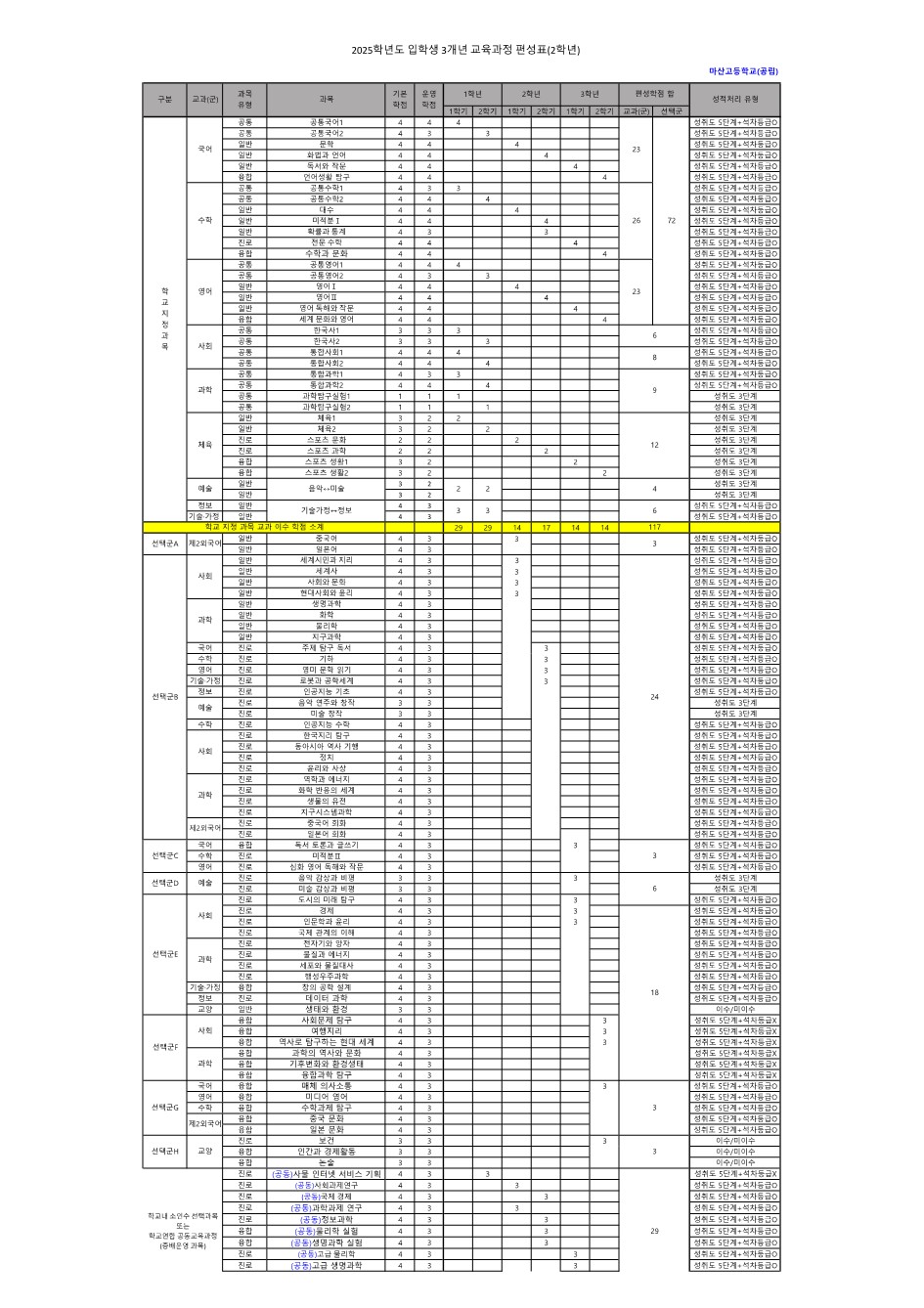 2025학년도 입학생 3개년 교육과정 편성표(2학년)